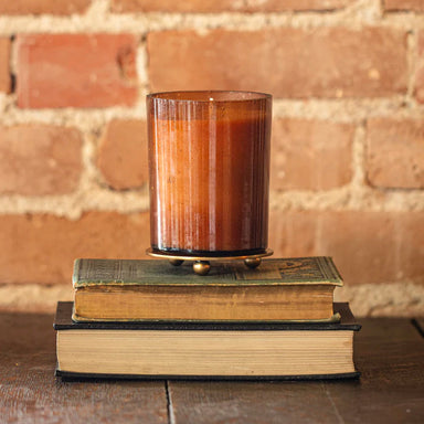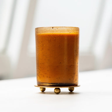 Handblown bubble glass vessels come in a warm golden-amber hue. Hand-poured with coconut wax blend. The beautiful golden lid may be used as a coast...