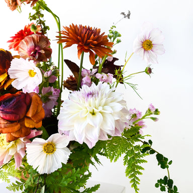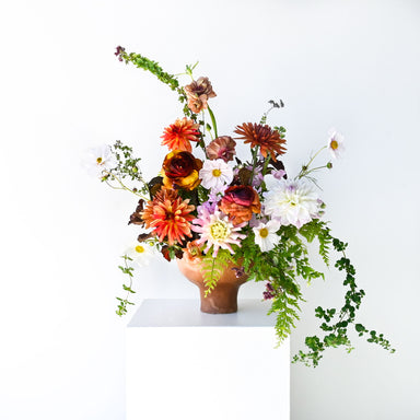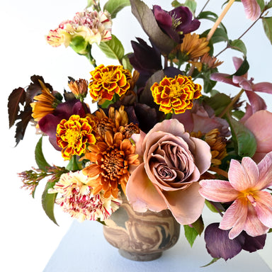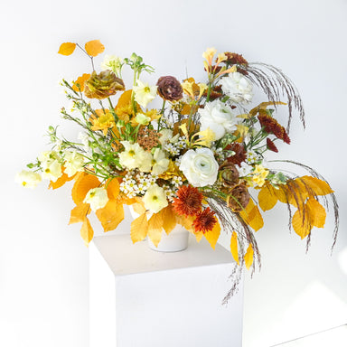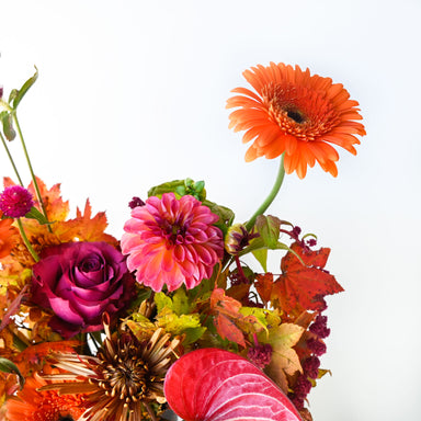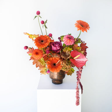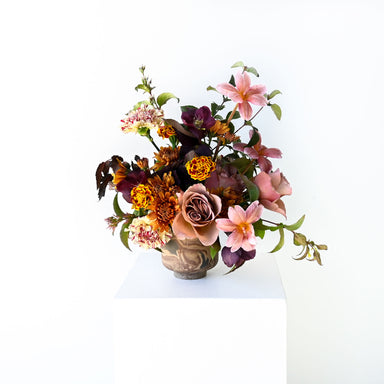View full detailsThis rich, earthy arrangement blends the warmth of autumn tones with soft, airy accents. Deep rust, copper, and amber-hued blooms anchor the design...