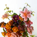In spirit of the changing of the seasons, we present you with a lush, moody composition that pairs the depth of autumn’s rich tones with soft, romantic accents. At its heart, velvety roses and marigolds in shades of russet, amber, and gold evoke the warmth of polished wood, while blush pink blooms bring a gentle lift. Dark foliage and plum undertones add a sense of mystery and contrast, all cradled in a marbled vessel that enhances its earthy elegance.
