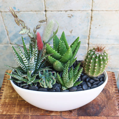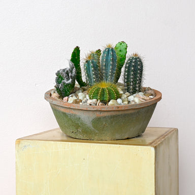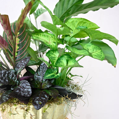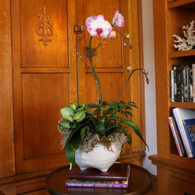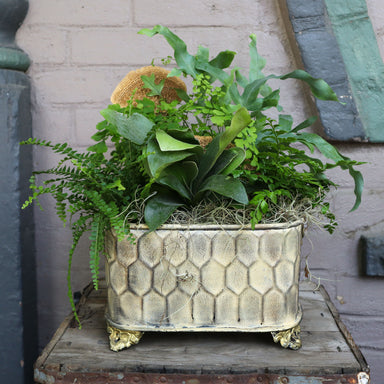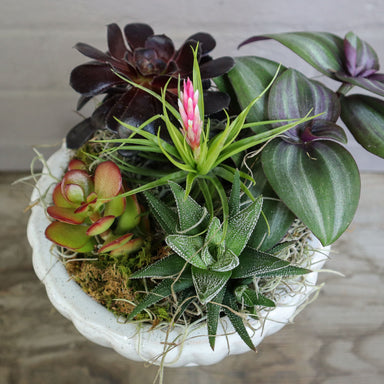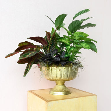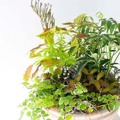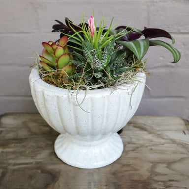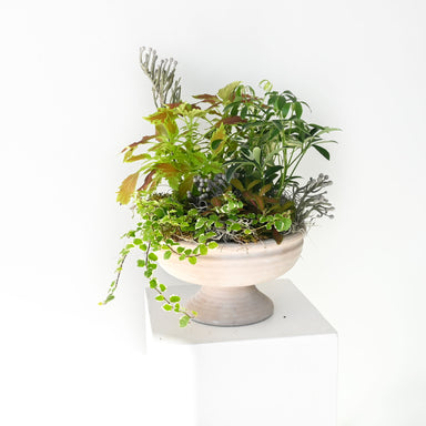 Garden Relic captures the beauty of nature in a timeless display. Lush greens spill gracefully over the edge of a classic compote, mingling with si...